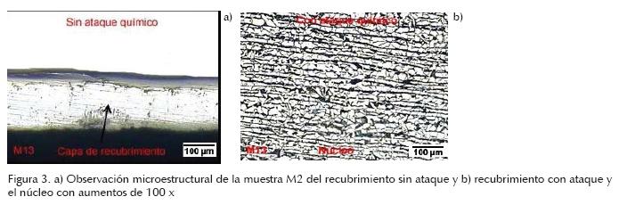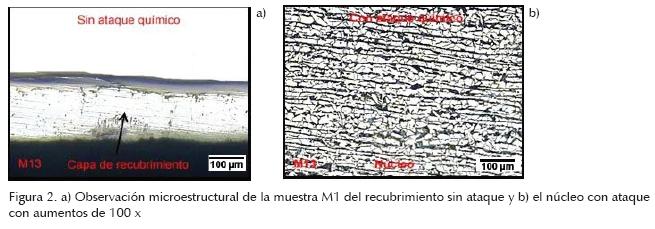 Las muestras fueron observadas con aumento de 100x. Antes del ataque químico, en la muestra M1 se observa una capa de recubrimiento de un espesor promedio de 135 μm, y después del ataque con nital a 2%, se observó en el núcleo una microestructura de ferrita en forma de granos más perlita formando bandas en el sentido del laminado (figuras 2a y b). En la determinación del espesor del recubrimiento por el método magnético se obtiene un espesor promedio de 145 μm, clasificando como Z 900 (ASTM A653-2006a).