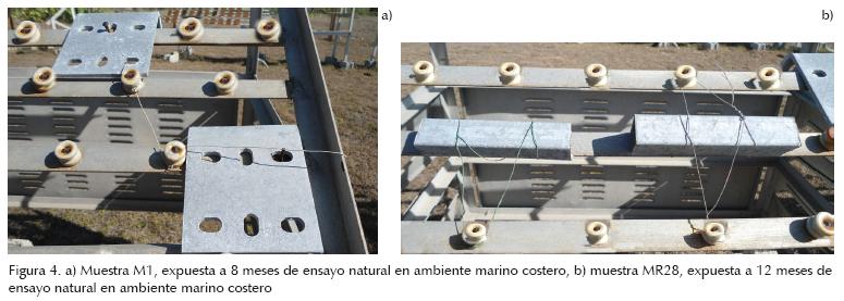 La muestra M1 lleva en exposición un periodo de 12 meses y se encuentran aún sin afectaciones. La figura 4a, muestra una fotografía de estas muestras en su evaluación tras 12 meses de exposición. Y la muestra MR28, correspondiente al perfil de acero galvanizado sin el recubrimiento protector de PVC, se encuentra expuesta por 17 meses, la figura 4b muestra una foto de esta muestra en su evaluación tras 12 meses de exposición, permaneciendo sin afectaciones.