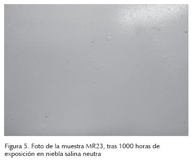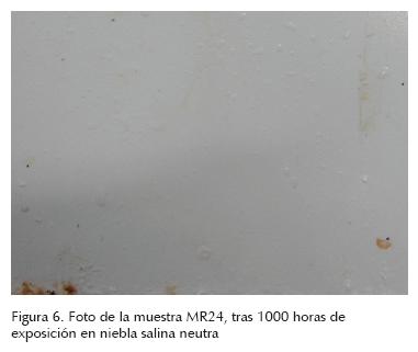 En el caso de las muestras MR23 y MR24, planchas de acero de galvanizado con recubrimiento de pintura electrostática de poliéster, ante el ensayo de niebla salina neutra presentaron un grado de ampollamiento de 2(S2) según norma de referencia (UNE EN ISO 4628-2: 2004), (figuras 5 y 6). Como se aprecia en la figura 6, la muestra MR24 presentó además signos incipientes de corrosión, presumiblemente debido a irregularidades de los aplicadores de pintura y/o a la limpieza previa de la superficie.
