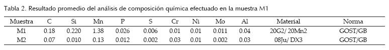 Por los valores de composición química obtenidos la muestra M1 se corresponde con un acero aleado al manganeso y la muestra M2 se corresponde con un acero especial para galvanizado 08Ju, reportado para trabajos de conformación en frío y de calidad (tabla 2).