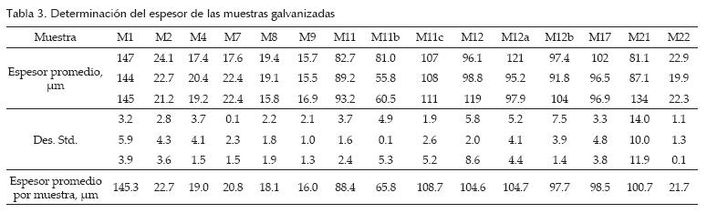 En los resultados del ensayo de determinación del espesor realizados en las diferentes muestras de la gama de productos evaluados (tabla 3), se obtuvieron valores promedios mínimos y máximos de 16.0 μm y 145.3 μm, por lo que las muestras clasifican como G 90 (ASTM A653-2006a) o superior.