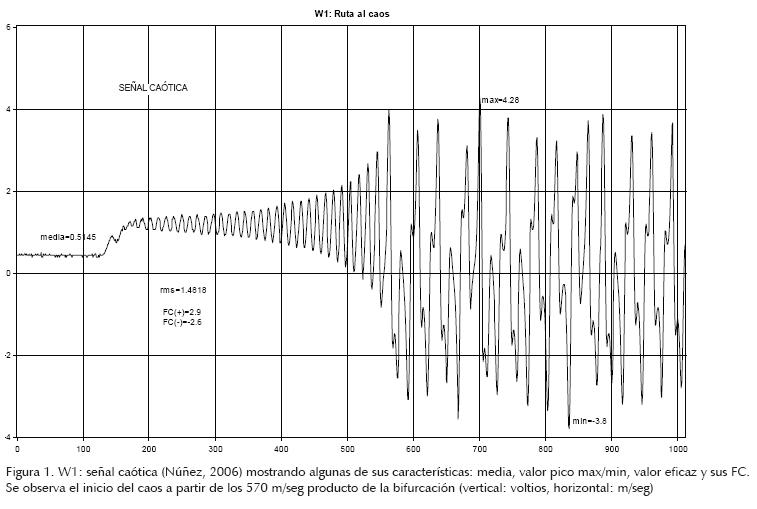 En la figura 15, se utiliza el programa DADISP para adquirir y posanalizar las dinámicas caóticas de las señales presentadas en las ventanas W1, W4 y W7 que corresponden a los valores del parámetro R8 de 1670 ohmios, de 1550 ohmios y de 1620 ohmios, respectivamente, y para las cuales se calculan sus FC que aparecen en las ventanas W3, W6 y W9 y cuyos valores son: 1.236663, 1.190571 y 1.231197, respectivamente. Observando la dinámica caótica de las señales generadas con diferentes parámetros y sus FC obtenidos, se puede deducir que: a mayor dinámica caótica, o caosidad (Núñez, 2009), corresponde una mayor distorsión y por ende la tendencia del FC también aumenta.