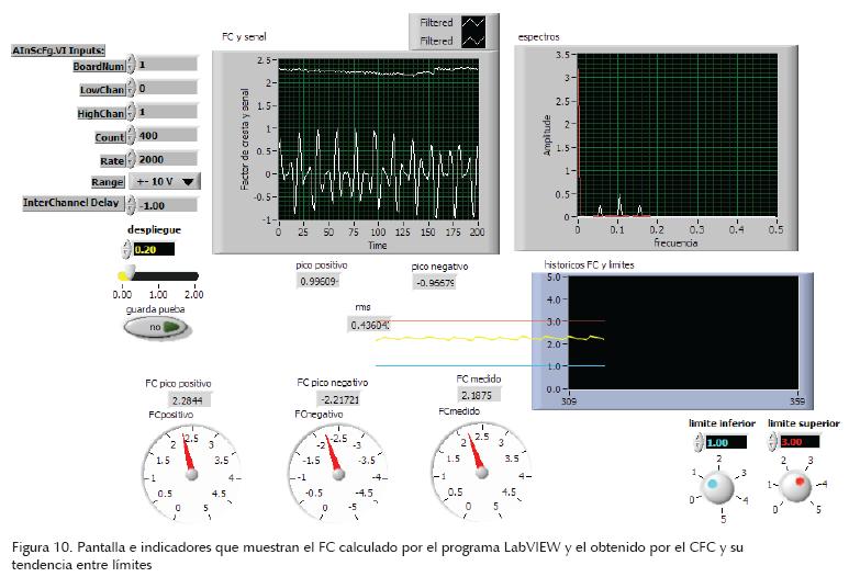 En la figura 10, en la pantalla: FC y señal, presentan la señal del Ve(t) operada (abajo) y su FC generado por el CFC (arriba). El valor instantáneo de este mismo factor se presenta en la carátula e indicador numérico: FC medido (derecha), y su tendencia se despliega en la pantalla: históricos FC y límites (derecha abajo). En los indicadores restantes, identificados con FC pico positivo y negativo, se presentan los valores instantáneos calculados del Ve(t) por el programa LabVIEW. Para esta prueba, se escoge como Ve(t) una señal modulada en amplitud de 210 Hz; en la pantalla de espectros se observa la fundamental y sus armónicas 110 y 310 Hz (horizontal: fm/2 canales = 2 Khz/2 = 1 Khz a escala completa, donde: fm = frecuencia de muestreo).