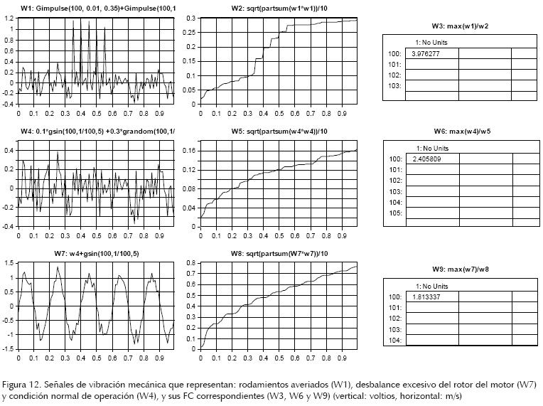 En las ventanas W4 y W6 de la figura 12, se presenta una señal de vibración típica de una chumacera del motor y su FC de 2.405809, respectivamente, en condiciones normales de operación. Mientras que en las ventanas W1 y W3, se muestra la misma señal pero ahora representa síntomas de rodamiento dañado en la chumacera del motor y con un FC de 3.976277, respectivamente. En el mismo sentido, en las ventanas W7 y W9 se presenta la misma señal, pero ahora corresponden a un síntoma de rotor del motor desbalanceado y con un FC de 1.83337, respectivamente. Como puede observarse, el FC de la señal de la chumacera de la máquina, operando normalmente, es 2.40589 y sufre una tendencia creciente o decreciente dependiendo del síntoma de rodamientos averiados o de rotor desbalanceado. Toda la generación y análisis se realiza utilizando el programa DADISP (2002).