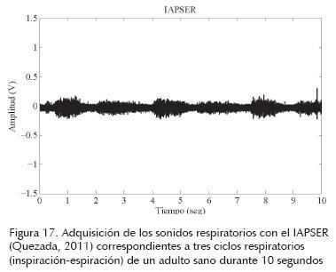 Dadas las características funcionales del factor mencionado y de su tendencia, se propone que puede utilizarse en el monitoreo (es decir, en la auscultación continua) de señales respiratorias con la finalidad de identificar síntomas de deficiencias nacientes o estertores comunes (Charbonneau et al, 2000; Díaz, 2008; Quezada, 2011). En la figura 16, se presenta el diagrama funcional del IAPSER: instrumento para la adquisición y preprocesamiento de señales respiratorias desarrollado por Quezada (2011) con el cual se adquirieron las señales respiratorias de un adulto sano mostradas en la figura 17 y que corresponden a tres ciclos respiratorios durante 10 segundos.