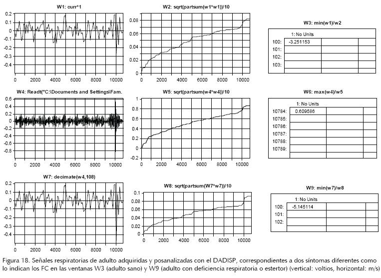 En las ventanas W1 y W7 de la figura 18, se presenta la señal respiratoria del adulto sano mencionado y otra de uno con deficiencias nacientes o estertores (como tos fuerte), respectivamente. Se calculan ambos FC con los niveles máximos que, para este caso, corresponden a los pulsos negativos. Se comparan y se observa una diferencia producto de la magnitud del estertor del adulto tosiendo.