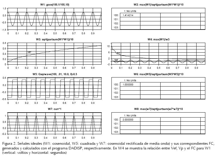 En la figura 2 se presenta una descripción gráfica del cálculo del FC (explicado en el segundo punto de esta sección) de tres señales ideales generadas y analizadas con el programa DADISP (2002). Las señales son: cosenoidal (W1: gcos (100,1/100,10)), cuadrada (W5: gs-qwave (100,1/100,10)), cosenoidal rectificada de media onda (W7) y sus FC obtenidos son: 1.4142 (W2), 1.0000 (W6) y 2.0000 (W8), respectivamente. Estos resultados coinciden plenamente con lo reportado en la bibliografía (Beckman Industrial, 1984). En las ventanas W3 y W4, se describe la evolución del voltaje de valor eficaz Vef de la cosenoidal y el traslape de éste (gráfica inferior) con la propia señal cosenoidal y con la evolución del FC (gráfica superior), respectivamente. Todas las señales generadas son de 1 voltio de pico, de 10 Hz, con una trama de 100 muestras y muestreadas a 100 Hz. Una señal cosenoidal ideal que se deforma presenta un FC mayor a 1.4142, dependiendo del grado de distorsión impuesto.