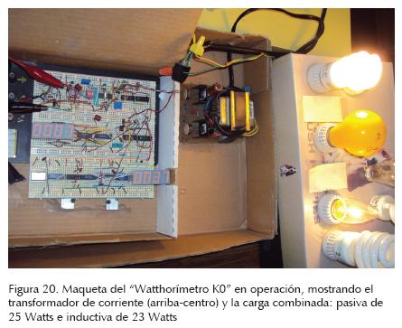 El medidor mencionado está constituido por un transformador toroidal de corriente, un amplificador diferencial y un convertidor de valor eficaz verdadero (Kitchin y Counts, 1983; Analog Devices, 1983). En la figura 19, se muestra a cuadros la sección mencionada y en la figura 20, la maqueta de este instrumento en operación. Como puede apreciarse en la fotografía de la figura 20, el circuito incorpora algunos contadores/ visualizadores para medir y desplegar el valor de la potencia instantánea y de la energía; si la carga es pasiva la medición es bastante precisa, pero si se hace reactiva, la carga se pierde. Por lo tanto, si se conoce el FC, se puede saber qué esperar de la señal medida; si viene distorsionada y registra un FC de 3 o menos es posible medirla aceptablemente con un amperímetro común pero si es mayor se debe utilizar un medidor de distorsión armónica total.