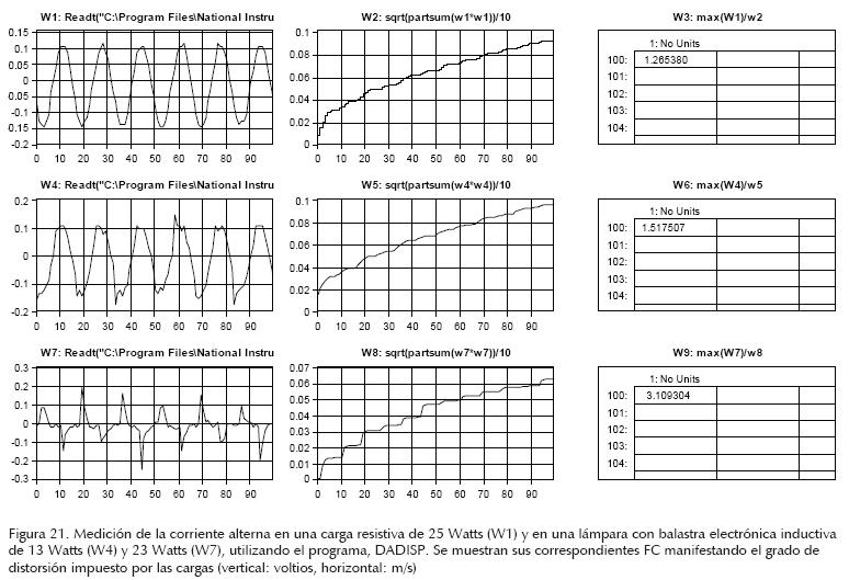 En la figura 21, se presentan las señales de corriente alterna instantánea en la carga y su correspondiente FC, para tres tipos de carga: a) pasiva de 25 Watts (W1), b) pasiva 60 Watts e inductiva de 13 Watts (W4) y c) pasiva 25 Watts e inductiva de 23 Watts (W7) para 120 Vca, y sus FC son: 1.265380, 1.517507 y 3.109304, respectivamente.