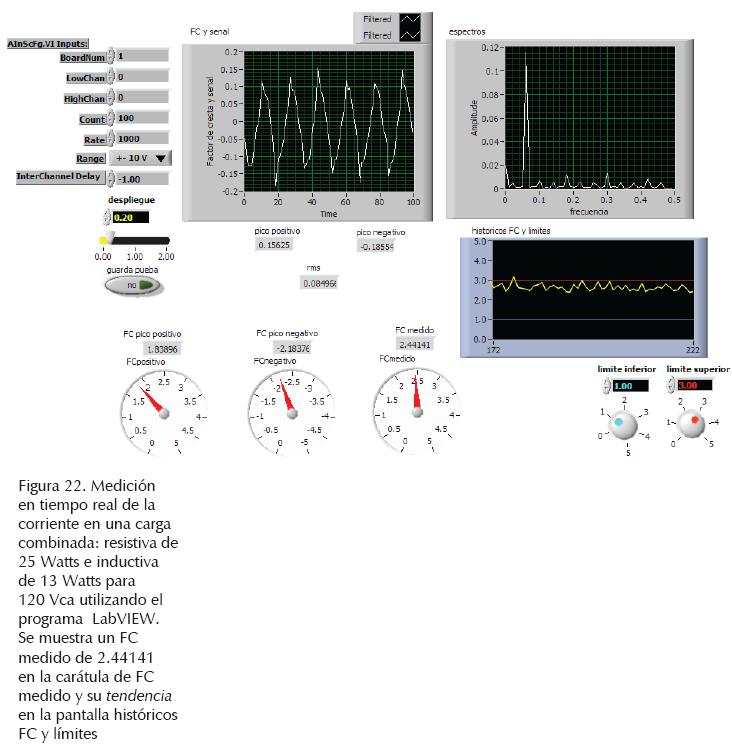 Por otro lado, en la figura 22 se presentan los resultados del cálculo y despliegue en tiempo real del FC con el programa LabVIEW. Para ello, se utiliza la pantalla: FC y señal (centro), en la cual se muestra la señal de corriente producida por una carga resistiva de 25 Watts y una lámpara ahorradora de 13 Watts (compare esta señal con la de la ventana W4 de la figura 21) y los indicadores numéricos (parte baja), en los cuales se presenta el FC (compare con el de la ventana W6 de la figura 21) y en la carátula: FC medido, se presenta el valor instantáneo medido del CFC y se grafica su tendencia en la pantalla: históricos FC y límites.