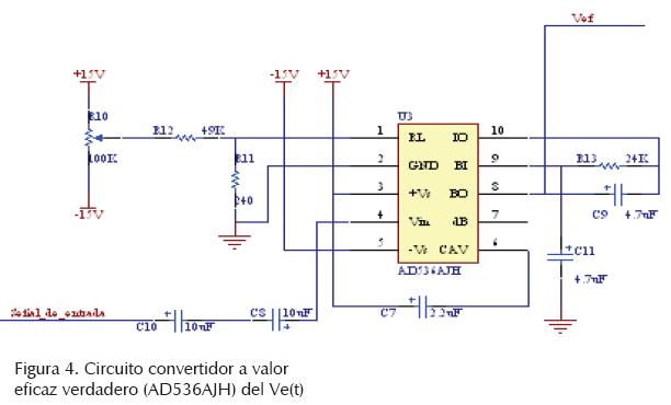 En la figura 4, se presenta el circuito que convierte el Ve(t) en uno de valor eficaz verdadero Vef. Para ello, utiliza el operador analógico AD536A-JH de Analog Devices (1982, 1983) y se diseña e implementa atendiendo las características y especificaciones propuestas, siguiendo las recomendaciones del fabricante (Analog Devices, 1983) y de otros (Counts et al., 1982; Kitchin y Counts, 1983 y Núñez, 1990). Se seleccionan los componentes cuyos valores produzcan un error menor a 1%, de la escala completa, y que el tiempo máximo de estabilización del circuito convertidor sea menor a 0.7 segundos, para ello se emplean las figuras 1 y 2 de Counts et al. (1982).