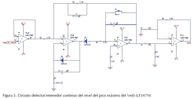 En la figura 5 se presenta el circuito detector/retenedor del nivel de pico máximo del Ve(t) construido con el amplificador operacional de entradas JFET LF347N de National Semiconductor (1984). Se diseña e implementa para obtener continuamente el nivel del pico máximo positivo (Stout y Kaufman, 1976; Coughlin y Driscoll, 1982) y se incorporan los circuitos para desacoplar la entrada (amplificador U2D/12) y reforzar la salida. En particular, en ésta última, se coloca un atenuador por 10 (amplificador U2A/1) necesario para acoplar al circuito divisor cuya función transferente así lo requiere (por ejemplo, Vs = 10*Vp/Vef).