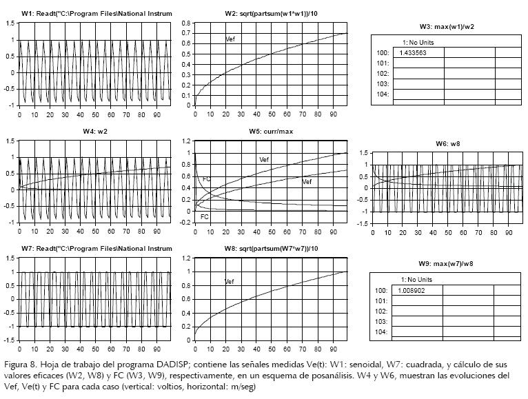 El programa DADISP calcula el factor mencionado por medio de la ecuación (5), como se indica en las ventanas W2 y W3, y en W8 y W9 de la hoja de trabajo de este programa que se presenta en la figura 8, para las señales medidas senoidal y cuadrada, respectivamente. En las ventanas W4 y W6, se muestra la evolución del voltaje de valor eficaz Vef (gráfica creciente) y el traslape de éste con la propia señal y con la evolución del FC (gráfica decreciente) para cada una de las señales estudiadas.