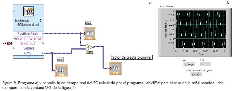Una de las principales ventajas que presenta el programa LabVIEW (National Instruments, 2007) es poder medir, operar y desplegar las señales o niveles de voltaje en tiempo real. Esto lo hace ideal para observar la tendencia del factor mencionado y sobre todo sus variaciones. En los incisos a) y b) de la figura 9, se presenta el programa y la señal en pantalla e indicadores numéricos que despliegan continuamente el valor del factor obtenido para el caso de la señal senoidal (compare con la señal ideal y su resultado mostrado en las ventanas W1 y W2 de la figura 2, respectivamente). Dado que ésta no está distorsionada su FC es 1.4142.