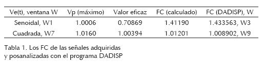 Como ya se comentó, se trabaja con señales producidas por el generador de funciones Agilent 33120A (Agilent Technologies, 2000), adquiridas con el sistema automático de prueba LabVIEW y postanalizadas con el programa DADISP (Núñez, 1998). En las columnas 4 y 5, de la tabla 1, se presentan los FC calculados directamente (es decir, por el cociente entre las columnas 2 y 3) y por el programa DADISP para cada una de las señales (compare con los resultados de las ideales en las ventanas W2 y W6 de la figura 2).