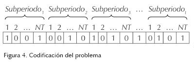El problema se codifica por medio de un vector de variables binarias. Este vector está dividido en t secciones de igual tamaño (una por cada subperiodo). El tamaño de las secciones se debe al número total de tramos de red del sistema bajo estudio. Por lo tanto, el tamaño total del vector de codificación está dado por NT*t, como se muestra en la figura 4. La variable binaria de decisión γ(i, t) está estrechamente conectada con la codificación, donde i es el tramo de red y t es el subperiodo de trabajo. La variable γ(i, t) es 1 cuando se realiza mantenimiento del tramo i en el periodo t y es 0 en caso contrario.