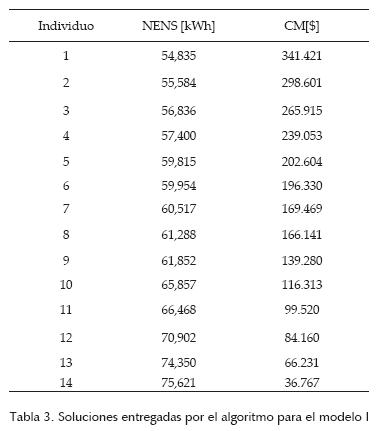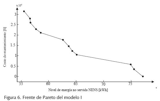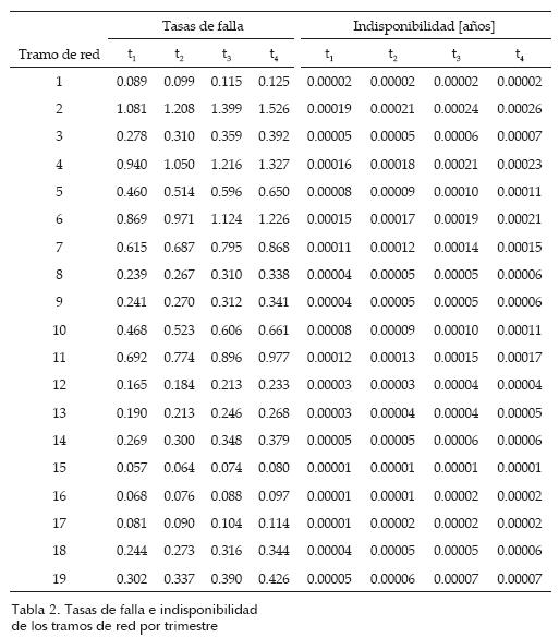 A continuación se presentan los resultados de la aplicación de la metodología de optimización NSGA-II al modelo matemático basado en tasas de falla, propuesto en el modelo I de la sección de formulación del problema. En la tabla 2 se presentan las tasas de falla y las indisponibilidades de los tramos de red del sistema, las cuales se obtienen a partir de datos históricos.
