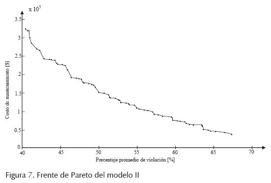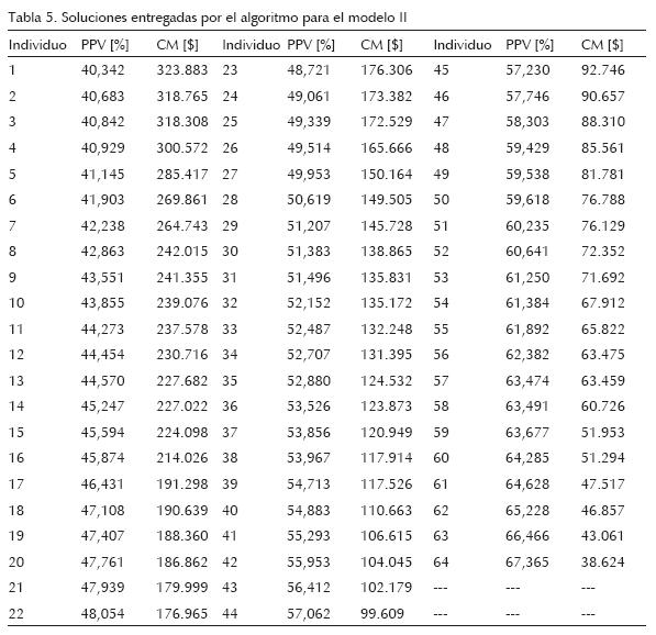 En la figura 7 se observa el frente de Pareto entregado por el NSGA-II. En la tabla 5 se ilustran las soluciones entregadas por el algoritmo. Se utilizó una población inicial de 100 individuos.