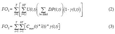 El primer modelo matemático describe el problema de mantenimiento de la vegetación a través de la minimización del NENS que tendrá el sistema debido a las interrupciones por vegetación durante el periodo de planeación del mantenimiento. En las ecuaciones (2) y (3) se muestran las funciones objetivo relacionadas con este modelo