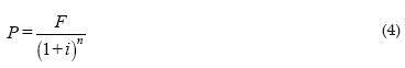 La función objetivo 2 presentada en la ecuación (3) calcula el costo de mantenimiento de la vegetación. Debido a que la poda de cada tramo de red tiene un costo establecido en un determinado subperiodo, es necesario trasladar este costo a valor presente por medio de una tasa de interés. Se puede observar que en esta ecuación el valor de mantenimiento se multiplica por la expresión γ(i, t), indicando un aumento en el costo cuando se debe realizar una poda en el tramo de red i. Para trasladar este valor a valor presente, se utiliza la ecuación (4):