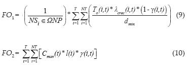En este trabajo se proponen dos modelos matemáticos multiobjetivo para solucionar el problema del mantenimiento de la vegetación bajo redes aéreas de distribución. El primer modelo considera como funciones objetivo las tasas de falla por vegetación y el costo de poda o mantenimiento de la misma. El segundo, considera las tasas de crecimiento de las especies de vegetación y el costo del mantenimiento. Ambos modelos están expresados de forma general de acuerdo con la ecuación (1), donde FO1 y FO2 corresponden a las dos funciones objetivo del modelo matemático.
