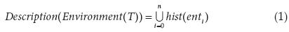 Esta descripción está compuesta por las historias que cada entidad tiene en el entorno durante su tiempo de vida (existencia) en el intervalo de tiempo T. Las historias de todas las entidades del entorno geográfico están relacionadas (en la ecuación (1) se denota como una unión) para formar la descripción de todo el entorno.
