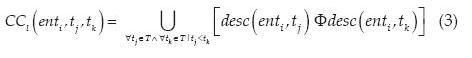 desc (enti, tj) y desc (enti, tk) representan las propiedades que tiene la enti en los instantes tj y tk, respectivamente. Estas descripciones pueden ser tanto en aspectos espaciales como en temporales.