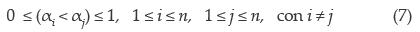 También en la figura 2 se aprecia que para cada partición de relevancia se asigna un valor αi que es el valor con el que podemos mapear el resultado obtenido de la función rel( ) para poder calificar la intersección entre dos historias. Como los valores αi son los límites de cada partición, para el caso de la jerarquía de la figura 2 tenemos (ecuación 7):