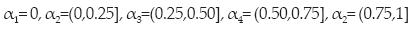 Para este ejemplo podemos asignar los valores considerando una separación equidistante entre cada nodo, entonces se tienen los siguientes valores: α1 = 0, α2 = 0.25, α3 = 0.50, α4 = 0.75, α5 = 1.0. Como la evaluación de la función rel( ) no siempre arroja un valor igual a algún αi, podemos asignar intervalos disjuntos de la siguiente forma: