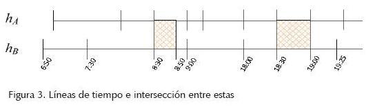 La descripción final resulta de la unión de estas dos historias de acuerdo con lo explicado sobre la unión de las historias. La clave es encontrar el punto en que éstas se relacionan, pues es lo que nos proporciona información adicional que con modelados tradicionales no se obtendría. En este ejemplo, si representamos las líneas de tiempo de las historias que se verían como se muestra en la figura 3.
