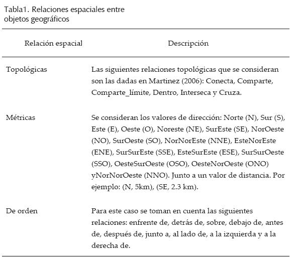 Donde pp ∈ P y P = {p1, p2, ..., pn} representa el conjunto de propiedades de enti y θ representa un operador del siguiente conjunto {<, ≤, =, ≠, ≥, >}. La relación espacial que existe entre enti y alguna otra entidad geográfica entj que pertenezca al contexto local1 de enti está representada por ψ, el cual puede tomar como valor alguna de las relaciones espaciales (tabla 1). Las relaciones temporales representadas por ω son algunas relaciones temporales de la tabla 2 entre enti y un evento ee. Estos ee ∈ E = {e1, e2, ..., em}, donde E representa el conjunto de eventos que se desarrollan en el periodo T.