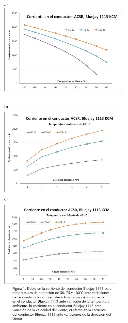 Los conductores tipo ACSR (Aluminum Conductor Steel Reinforced) son los más utilizados a nivel mundial, estos conductores están diseñados para operar a una temperatura continua máxima de 100°C, sin embargo, normalmente se supone una temperatura total de 75°C debido a que su uso tiene un buen desempeño del conductor (Westinghouse Electric Corporation, 1950). En general, las empresas eléctricas consideran en el análisis temperaturas de operación del conductor que van desde 50°C hasta 100°C. En la figura 1 se muestra el comportamiento de la corriente a través de un conductor Bluejay, calibre 1113 KCM considerando las temperaturas de operación del conductor de 50°C, 75°C y 100°C ante variaciones de la temperatura ambiente, velocidad del viento, ángulo del viento y altura sobre nivel del mar. A menos que se indique lo contrario, los valores considerados en el análisis son los siguientes: temperatura ambiente de 40°C, velocidad del viento de 2 m/s, ángulo del viento 45°C (con respecto al conductor) y una elevación de 1600 m sobre el nivel del mar.