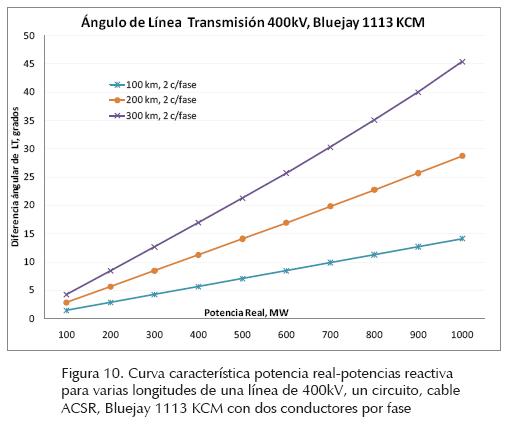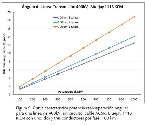En la figura 9 se muestra la diferencia entre los ángulos de voltaje de los extremos de una línea de 400kV, un circuito, cable ACSR, Bluejay, calibe 1113 KCM, 100 km de longitud con uno, dos y tres conductores por fase. Se puede observar que al incrementar el flujo de potencia real por la línea, aumenta la separación angular entre ambos extremos de la línea. Se observa que cuanto mayor es el número de conductores por fase menor es la separación angular del voltaje en ambos extremos de la línea. La separación angular entre los voltajes de los extremos de la línea es menor al incrementar el nivel de tensión.