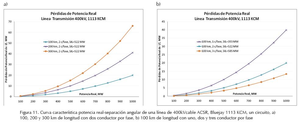 En la figura 11 se observa el comportamiento de las pérdidas de potencia real de una línea de 400kV, un circuito, cable ACSR, Bluejay, calibe 1113 KCM para diferente longitud de línea (figura 11a) y para distinto número de conductores por fase (figura 11b). Las pérdidas de MW presentan un comportamiento cuadrático (I2R). Como se observa en la figura 11a, las pérdidas de potencia real se incrementan al aumentar el flujo de potencia real y la longitud de la línea. Por el contrario, las pérdidas de MW disminuyen al aumentar el número de conductores por fase.