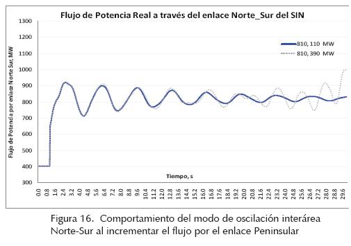 La figura 15 muestra el comportamiento dinámico del modo de oscilación interárea de 0.32 Hz ante el incremento del flujo de potencia de 810 a 935 MW a través del enlace Norte-Sur. Se observa que ante la contingencia se excita la oscilación del modo y a mayor flujo de potencia por el enlace mayor es la amplitud de la oscilación. Para ambos niveles de transferencia el amortiguamiento es positivo, indicando que el sistema es estable. Estos resultados son congruentes con los obtenidos en los casos 1 y 2.