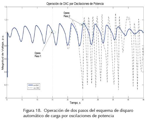 Para el caso de oscilaciones interárea con amortiguamiento negativo se pueden utilizar esquemas de protección automáticos (Castellanos et al., 2008) que realicen el disparo/desconexión de carga y/o generación ante oscilaciones con amortiguamiento negativo. La figura 18 muestra la aplicación de un esquema de corte de carga por oscilaciones de potencia. La contingencia crítica utilizada en el análisis es la salida de operación de un circuito del enlace Norte-Sur ante una falla trifásica en un extremo de la línea.
