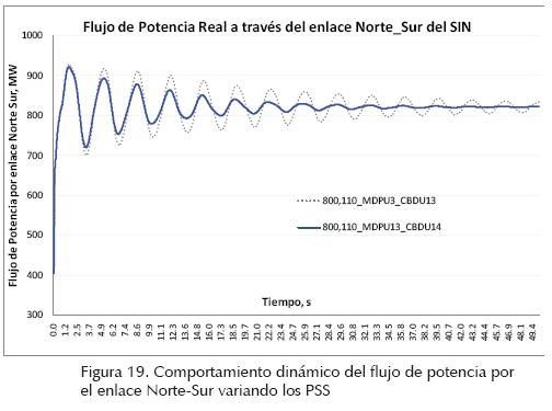 La figura 19 muestra el comportamiento dinámico del flujo de potencia por el enlace Norte-Sur del SIN al variar el número los PSS conectados a máquinas con alta participación del modo de oscilación de 0.34 Hz. Se observa que al aumentar el número de los PSS mejora el nivel de amortiguamiento de la oscilación de potencia.