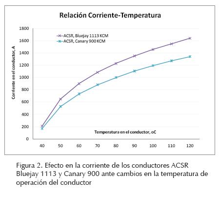En la figura 2, se presenta la curva característica corriente-temperatura de los conductores ACSR Bluejay, calibre 1113 KCM y Canary 900 KCM. Al aumentar la capacidad de transmisión de corriente se incrementa la temperatura de operación del conductor y entre mayor es la temperatura en el conductor mayor es la diferencia entre las capacidades de conducción de corriente de ambos calibres.