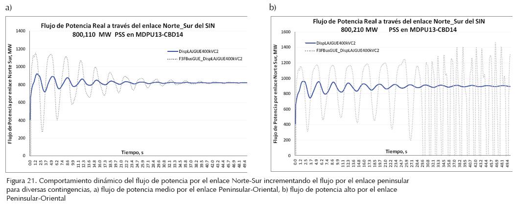La figura 21 muestra el comportamiento dinámico del flujo de potencia por el enlace Norte-Sur del SIN ante diversas contingencias para dos condiciones de flujo a través del enlace Peninsular-Oriental. Se observa que el tipo de contingencia tiene alta influencia en el comportamiento dinámico de la oscilación. Así, la figura 21b indica que incrementando el flujo por el enlace Peninsular-Oriental el modo de oscilación de 0.34 Hz Norte-Sur la operación de la red eléctrica puede experimentar una condición de inestabilidad ante falla trifásica en el Bus Gue_400 kV con disparo de uno de los dos circuitos de la línea Laj_Gue_400 kV.
