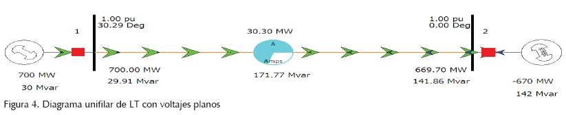 La cargabilidad de una línea de transmisión indica la capacidad de potencia que puede fluir por la línea bajo condiciones de operación aceptables. La cargabilidad de la línea está en función del calibre y la longitud de la línea, para conocer su comportamiento se consideran condiciones óptimas de voltaje en ambos extremos de la misma, es decir, un voltaje de 1 p.u. tanto en el nodo de envío como en el de recepción, como se muestra en la figura 4.