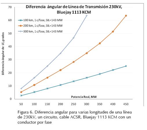 En la figura 6 se muestra la diferencia entre los ángulos de voltaje de los extremos de una línea de 230kV, un circuito, cable ACSR, Bluejay, calibe 1113 KCM con un conductor por fase para longitudes de 100, 200 y 300 km. Se puede observar que al incrementar el flujo de potencia real por la línea, aumenta la separación angular entre ambos extremos de la línea. Considerando una separación angular máxima de 35 grados, el límite de estabilidad de estado estable de esta línea es 200 MW para una longitud de 300 km, 300 MW para una longitud de 200 km y 600 MW para una longitud de 100 km (no mostrado en la figura). También, se observa que cuanto mayor sea el nivel de transferencia de potencia real mayor será la separación angular entre los extremos de la línea de distintas longitudes.