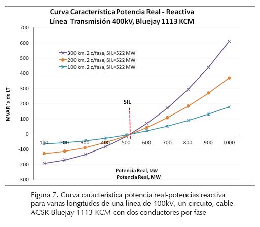 En la figura 7 se muestran curvas características de la relación de potencia real-potencias reactiva de una línea eléctrica de 400kV con un circuito, conductor ACSR, Bluejay, calibre 1113 KCM y dos conductores por fase para longitudes de 100, 200 y 300 km. Se observa cómo al incrementar el flujo de potencia real (MW) a través de la línea, se incrementa el consumo de potencia reactiva (MVAR) en la reactancia inductiva serie de la línea eléctrica. En este caso, el SIL de la línea de transmisión es 522 MW. Se puede observar, que igual que para el caso de 230 kV (figura 5), el SIL de la línea es independiente de su longitud.