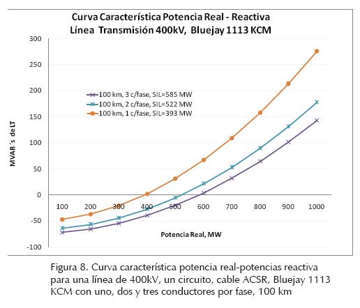 En la figura 8 se muestran curvas características de la relación de potencia real-potencia reactiva de una línea eléctrica de 400kV, un circuito, conductor ACSR, Bluejay, calibre 1113 KCM, 100 km con uno, dos y tres conductores por fase, respectivamente. Se observa cómo al incrementar el número de conductores por fase se incrementa la potencia reactiva capacitiva suministrada por la línea y se reduce la potencia reactancia inductiva absorbida por la línea eléctrica. En este caso, cuando la línea de transmisión tiene uno, dos y tres conductores por fase el SIL es 393, 522 y 585 MW, respectivamente.