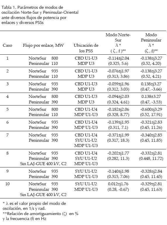 En la tabla 1 se muestran los parámetros de los modos de oscilación Norte-Sur y Peninsular-Occidental para diversos flujos por los enlaces entre áreas y considerando diversos estabilizadores del sistema de potencia (PSS) tanto para condiciones de operación en precontingencia como ante contingencia. La contingencia considerada es la desconexión de la línea Laj_Gue-400 kV. En el Sistema Eléctrico Interconectado Mexicano hay otros PSS, sin embargo aquí solo se indican aquellos que tienen una fuerte influencia en el comportamiento de los modos interárea bajo estudio.