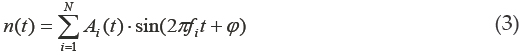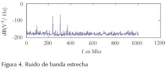 Ruido de banda estrecha: este ruido se compone de señales de radio que se encuentran en el espectro, por esto, la intensidad y la frecuencia dependen del espacio y del tiempo. Este ruido se puede expresar como la suma de funciones sinusoidales con diferentes amplitudes, una representación gráfica está dada en la figura 4.
