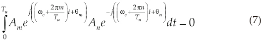 Si cada fase y amplitud se mantienen estables durante todo el periodo de símbolo, como se especifica en la teoría, entonces se puede demostrar la ortogonalidad que existe entre las subportadoras. Comprobando que para valores diferentes de los índices m y n se cumple que el producto punto de dos cualesquiera señales moduladas está dado por