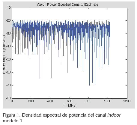 En lo referente a este trabajo nos interesa solo el modelo 1, en la tabla 2 se anotan los tiempos y la amplitud utilizados en las simulaciones, asimismo en la figura 1 se muestra la densidad espectral de potencia de dicho modelo, en donde se ven claramente las grandes atenuaciones en ciertas frecuencias. Para tener más detalles de los modelos indoor el lector puede referirse a (Cañete et al., 2002).