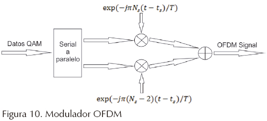 Para este caso, las partes real e imaginaria corresponden a las partes en fase y en cuadratura de la señal. Tienen que multiplicarse por una forma de onda coseno o una sinusoide para determinar la frecuencia de la señal OFDM. Las figuras 10 y 11 muestran un diagrama a bloques de un modulador OFDM.