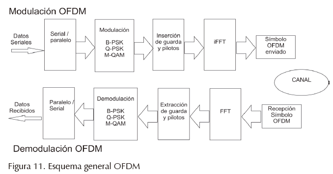 Al requerir OFDM de una señal constituida por la suma de señales, el dominio de la frecuencia corresponde a frecuencias adyacentes, con una separación constante. Esta disposición coincide con la utilizada en la información del contenido espectral que tiene la FFT. Es por eso que para la generación y transmisión de OFDM, se utiliza la transformación inversa iFFT, ya que el paso previo en el esquema de transmisión consiste en hacer un mapeo del contenido de cada subportadora para que luego la transformada inversa convierta esta información en las muestras de una señal en tiempo. En el lado del receptor; por lo tanto, la transformación directa FFT es la que hace la operación de separar los datos entre subportadoras en el demodulador. La figura 11 muestra el esquema general de un sistema OFDM.
