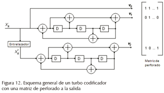 Sin embargo, esto representa un reto, porque en muchas aplicaciones en tiempo real esta longitud es difícil de alcanzar, en consecuencia la pregunta es ¿cómo diseñar un turbo codificador que mantenga sus buenas características de baja probabilidad de bit error, del orden de 105, para una razón señal a ruido Eb/N0 también baja, entre 1 y 5 dB, pero al mismo tiempo con una longitud de trama de datos de unas cuantas centenas de bits? El esquema general del codificador se muestra en la figura 12, en el cual se puede observar la estructura de dos codificadores convolucionales, así como un entrelazador a la entrada del segundo codificador X'k y adicionalmente una matriz de perforado que permite cambiar la tasa global r del código. Esto es, con la matriz de perforado se anulan o perforan ciertos bits normalmente de las salidas de redundancia: v1 y v2, para alcanzar la tasa requerida (Lazcano y García, 2007, 2012). De las tres salidas del codificador, v0 es la salida sistemática salida directa de información sin pasar por el codificador, e igual a X'k. Adicionalmente, v1 y v1 son las salidas de redundancia respectivas de los codificadores 1 y 2. Por otra parte, en la figura 13 se tiene el diagrama del turbo decodificador, el cual está compuesto por dos decodificadores convolucionales, así como el mismo entrelazador usado en el codificador, y su respectivo desentrelazador. Como se mencionó, el proceso de decodificación es iterativo, el primer decodificador recibe las señales r0 y r1. Su correspondiente salida W1k se envía a través del entrelazador al segundo decodificador, el cual también recibe la señal r0 pasada a través del entrelazador, y la señal r2. La salida del decodificador 2, W2k, se envía a un entrelazador inverso (o desentrelazador) y se trasmite al primer decodificador. Con este lazo se logra el proceso que se describió, llamado "turbo", mismo que es iterativo. Una vez terminadas las i iteraciones (en la práctica, del orden de una decena), se toma finalmente una decisión dura para determinar el valor de los bits decodificados.